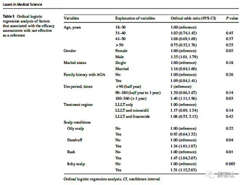 结果发现,男性(P=0.02)、使用180次以上(P=0.03)、头皮有头皮屑(P=0.04)、皮疹(P=0.01)、瘙痒症状(P=0.003) 与疗效评估呈正相关。